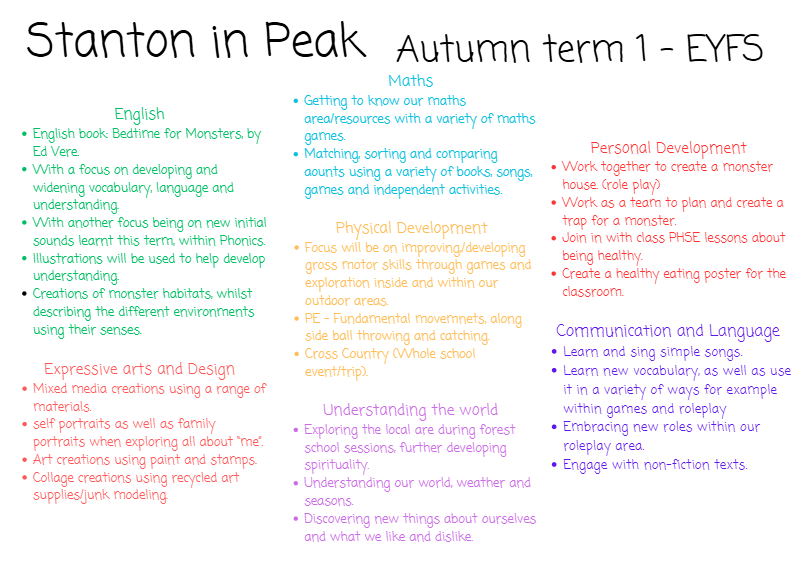 We have designed our curriculum to deliver the national primary objectives and ELG's in a way which not only reflects our values as a school community but fosters the most meaningful experiences and application of learning for our pupils. We want each child to leave Stanton with a strong foundation of knowledge and understanding of the world in which we live: an appreciation of its diverse cultures; respect for our changing environment and to be positive global citizens. Each term children will focus on a different topic/country, studying its geography, history, culture and significant contributions to society.